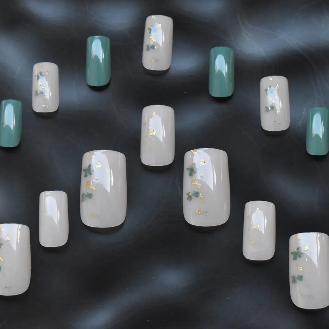 Where natural charm meets a touch of glam—Glitz Green brings you the perfect blend of soft nude tones, refreshing green, and delicate gold foil detailing. With hand-painted botanical accents and a pop of glossy sage, this set captures a sophisticated earthy vibe. Whether you’re channeling boho elegance or minimalist luxe, these nails are your go-to style statement.