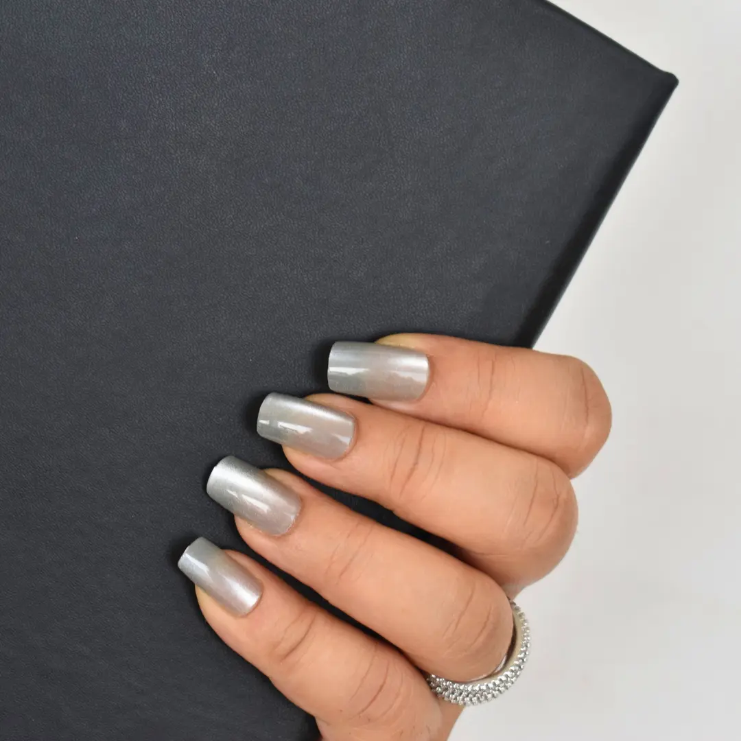 A serene shimmer that captures the quiet elegance of moonlight on mist—Silver Glow is all about minimal sophistication with a celestial twist. These press-ons feature a frosty silver chrome sheen, making every glance at your fingertips feel like a soft breath of winter magic.