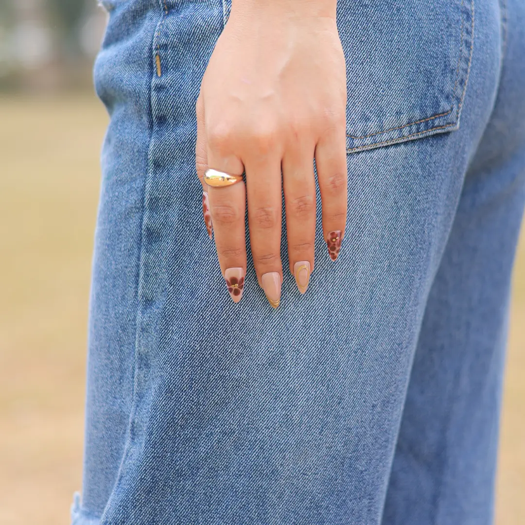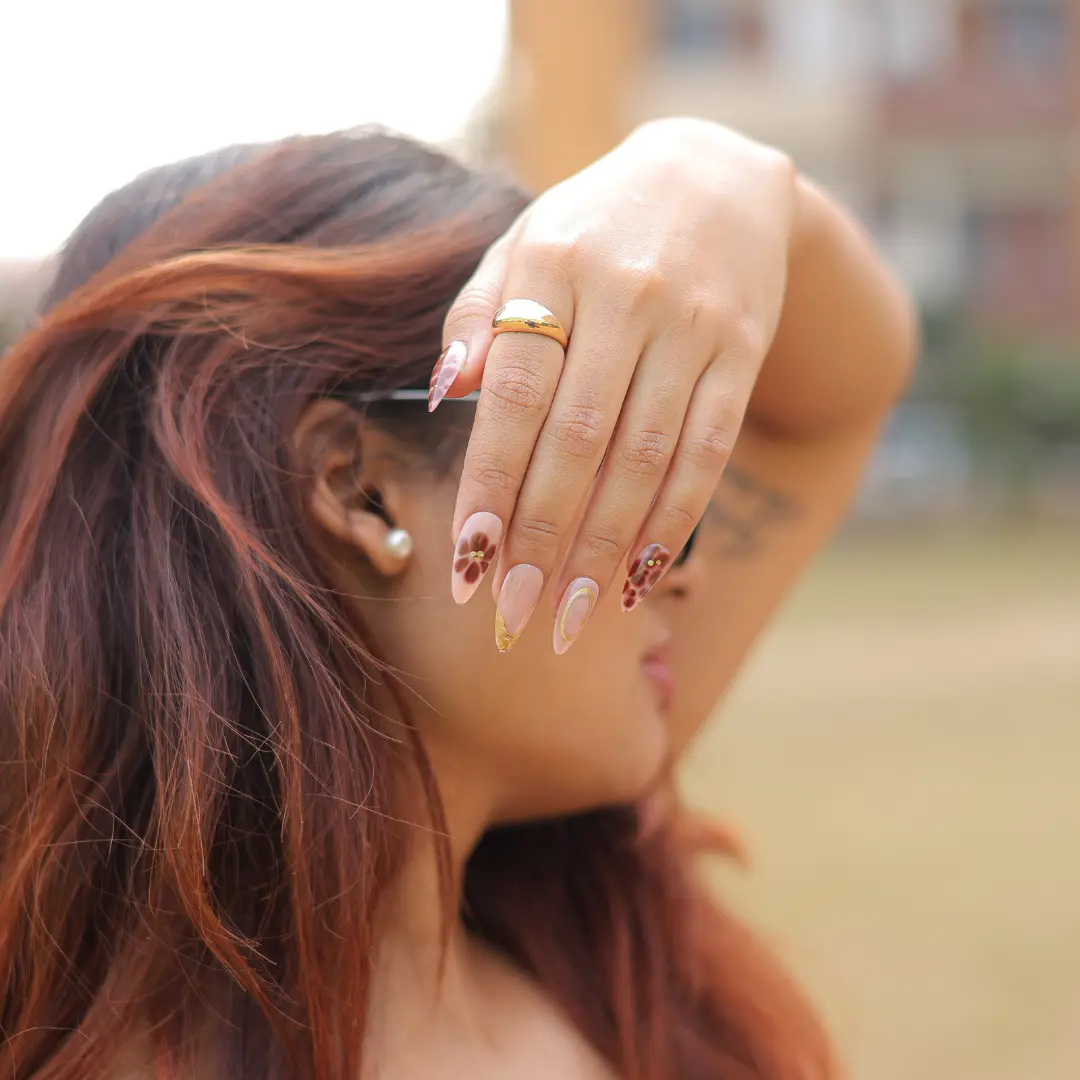Hazel Hottie by Soul Struck is a rich blend of earthy elegance and modern glamour. Designed with a sheer nude base, this set features warm hazel-brown accents, delicate floral-inspired detailing, and refined gold touches that add depth and dimension. The look is soft yet striking—perfectly balancing subtle neutrals with statement artistry. Ideal for evening outings, festive gatherings, or elevating everyday style, Hazel Hottie is made for those who love timeless tones with a sultry edge.