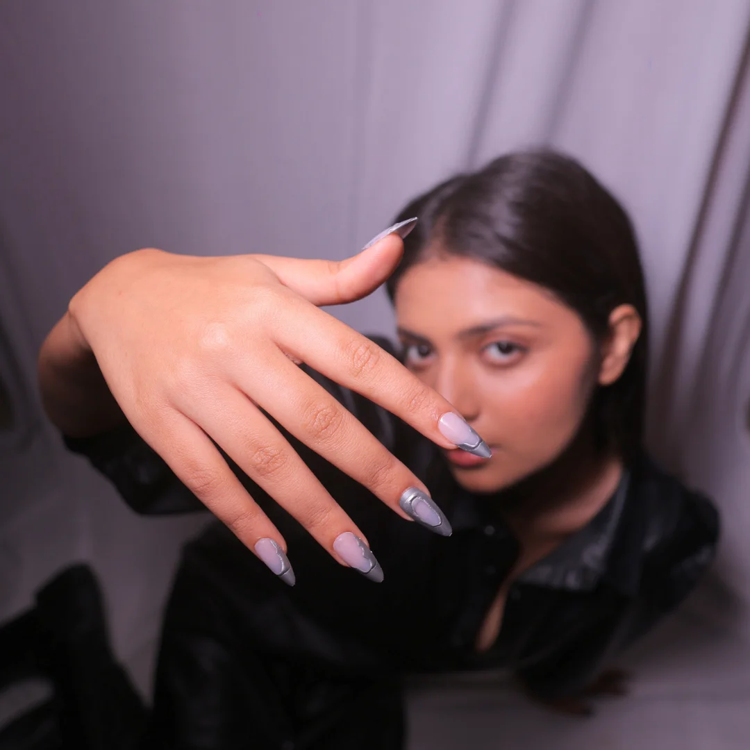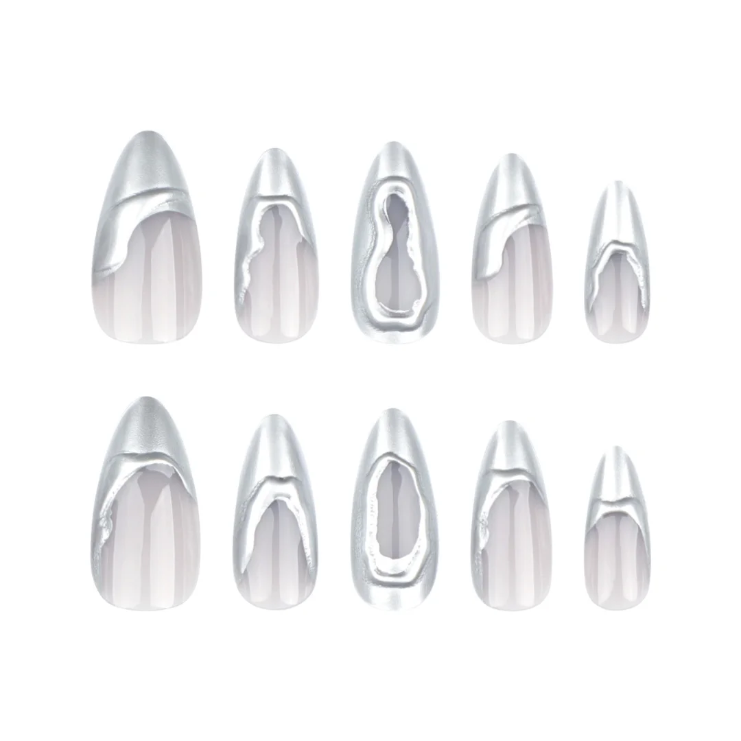 Molten Muse by Soul Struck is a bold expression of futuristic luxury and sculptural beauty. Designed with a soft sheer nude base and elevated by dramatic liquid-chrome silver accents, this set channels the raw allure of molten metal. The fluid, high-shine chrome detailing creates a striking contrast against the muted base, delivering a look that feels edgy yet refined. Perfect for fashion-forward moments, night events, or statement styling, Molten Muse is made for those who dare to stand out.