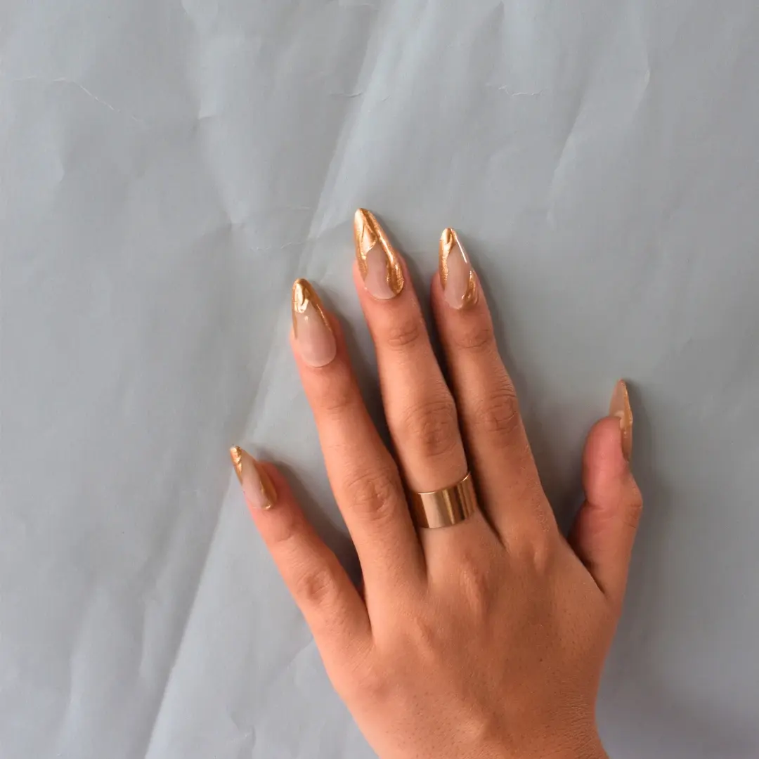 Drenched in elegance and dripping with glam, Why So Sexy? is your golden hour moment—on your fingertips. This nude-pink base meets molten gold chrome swirls for a design that’s sultry, bold, and unapologetically luxe. Whether you’re dressing up for a night out or simply vibing in style, this set whispers confidence and seduction with every gesture.
